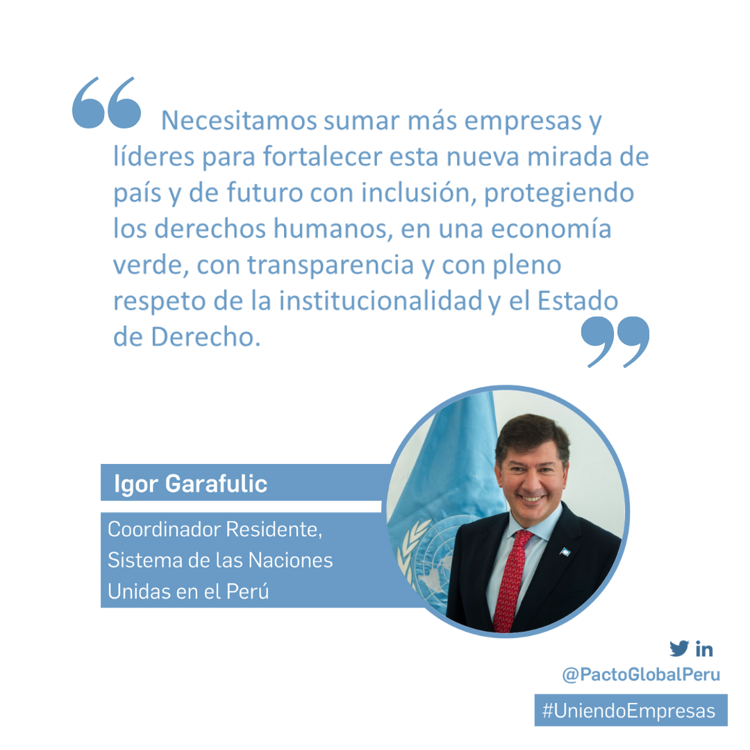 Igor Garafulic, Resident Coordinator of the United Nations System in Peru, stressed that "we need to add more companies and leaders to strengthen this new vision of the country and of the future with inclusion, protecting human rights, in a green economy, with transparency and with full respect for the institutional framework and the rule of law" in order to follow the roadmap set by the 2030 Agenda and its Sustainable Development Goals (SDGs) and solve the country challenges that have been identified and will be addressed in the Framework of Cooperation