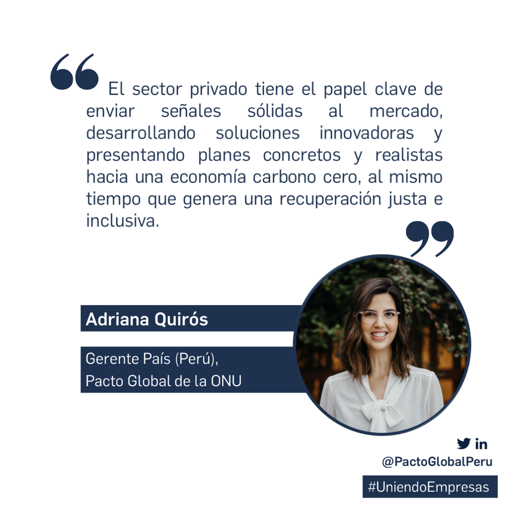 Among its lines of action, Adriana Quirós, Country Manager of the Global Compact Peru, highlighted the work of guiding companies in the respect, promotion and remediation of human rights "in practice", since "it is not possible to be committed to sustainability if a vision of human rights is not incorporated.” Likewise, he highlighted climate action, emphasizing that "the private sector has a key role in sending strong signals to the market, developing innovative solutions and presenting concrete and realistic plans towards a zero carbon economy, while generating a fair recovery." and inclusive.”